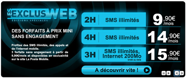 Uniquement disponibles sur le Web, et simplement nommées "Exclus web", les nouvelles offres La Poste Mobile sont sans engagement et avec un service après-vente garanti sur 10 000 bureaux de Postes partenaires.