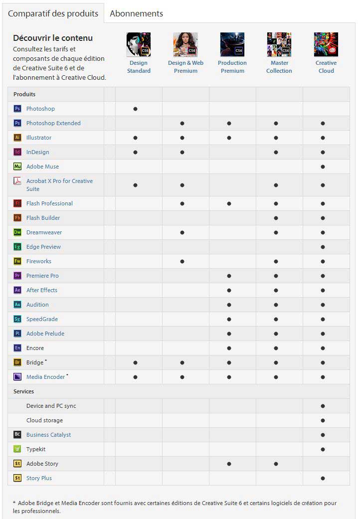 C'est donc 5 versions (Design Standard, Design & Web premium, Production premium, Master collection et Creative cloud) qui seront disponibles pour Adobe Creative Suite 6 (CS6 pour les intimes).
