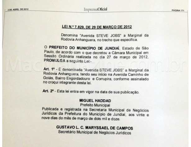 C'est à Jundiai (Brésil), une ville de 350 000 habitants près de São Paulo où est implantée une usine Foxconn qui alimente le territoire brésilien en iPhone qu'a été inaugurée la Steve Jobs' Avenue.