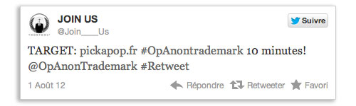 et sur Twitter, où les incitations aux attaques des sites de l'agence (pickapop.fr et eflicker.fr) se multiplient ces dernières heures à l'aide du hashtag #OpAnonTrademark