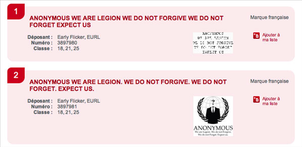 Le slogan et logo du collectif Anonymous sont donc désormais une marque déposée suite à la demande par la société française E-Flicker (ou Early-Flicker) acceptée par l'INPI au début du mois de juin.