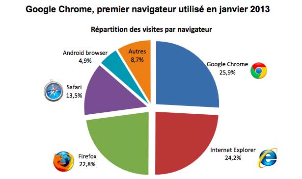 Médiamétrie-eStat a donc publié son étude sur la fréquentation des sites Internet : en janvier 2013 Google Chrome est donc le navigateur le plus utilisé avec 25,9% d'utilisation, suivi de près par Internet explorer (24,2%) puis Firefox (22,8%).