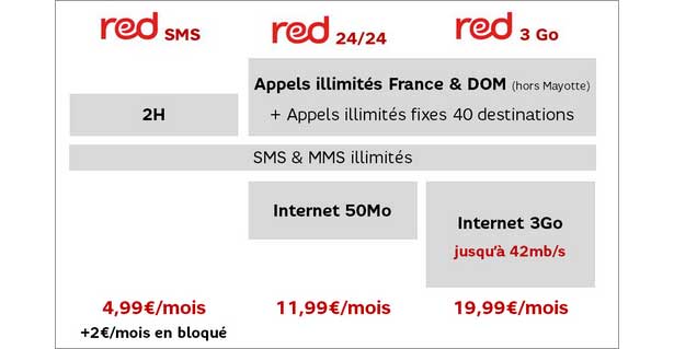 le forfait RED 3 Go dispose désormais de la 3G+ jusqu'à 42 Mb/s, une nouvelle offre RED à 11,99 €/mois avec SMS, + MMS + appels illimités en France et vers les fixes de 40 destinations (les appels vers les fixes et les mobiles des DOM seront inclus dans les forfaits RED à partir du 5 février 2013) + 50 Mo de data et enfin une option à 2€/mois pour bénéficier d'une version bloquée du forfait Red 2H + SMS&MMS illimités. Tous les clients Red, bénéficient automatiquement de ces nouveautés.